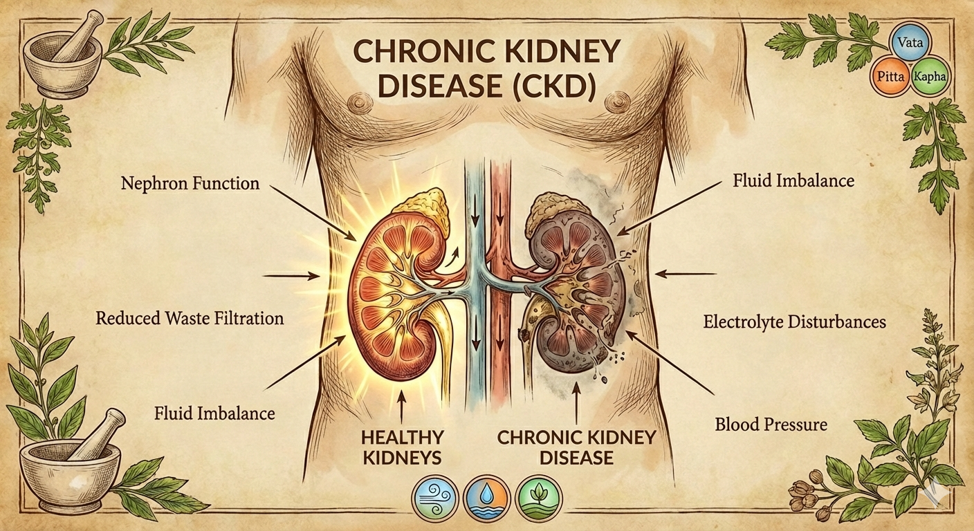 Explore how Ayurveda understands Chronic Kidney Disease (CKD), its root causes, and how a holistic, body-centered approach focuses on preserving kidney function and improving quality of life.